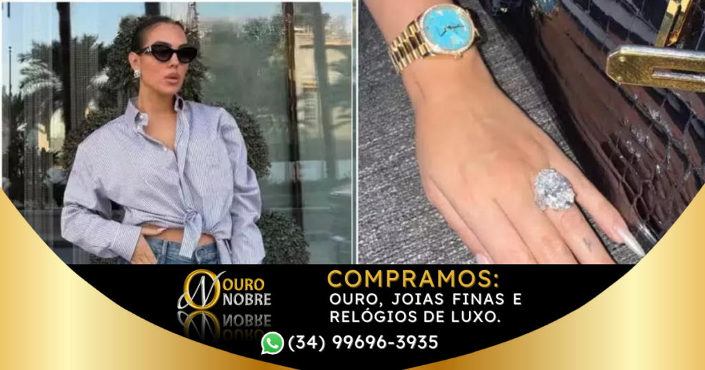 Além do anel, Georgina usava um relógio de luxo em ouro amarelo cravejado de diamantes, cotado em mais de R$ 1 milhão, reforçando o status de peças de altíssimo padrão.
